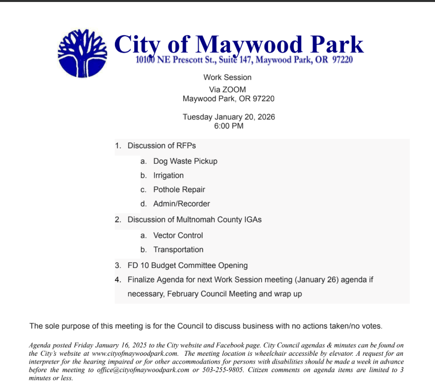 Agenda for Council Work Session Tuesday, January 20, 2026 6:00 pm Announcements Jan 15 Written By Dalene Bloom This meeting will be held via ZOOM and will be available for public viewing via Zoom. Click HERE for Meeting Agenda Click HERE for Goals and Priorities Outline Click HERE for Zoom Dalene Bloom